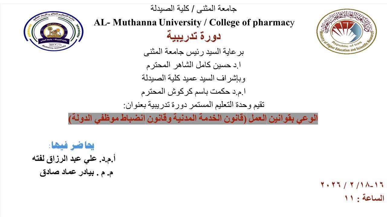 تتشرف وحدة التعليم المستمر في كلية الصيدلة بدعوتكم لحضور الدورة التدريبية الموسومة: