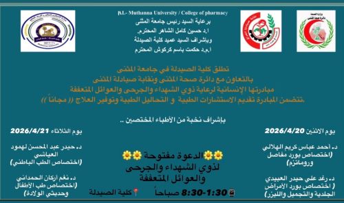 برعاية السيد رئيس جامعة المثنى الأستاذ الدكتور حسين كامل الشاهر المحترم، وبإشراف السيد عميد كلية الصيدلة الأستاذ المساعد الدكتور حكمت باسم كركوش المحترم، أطلقت كلية الصيدلة مبادرة إنسانية نوعية تهدف إلى تقديم الدعم والرعاية الصحية لذوي الشهداء والجرحى والعوائل المتعففة، تجسيداً لقيم الوفاء والعطاء وتعزيزاً لمبدأ التكافل الاجتماعي، بالتعاون مع دائرة صحة المثنى ونقابة الصيادلة.