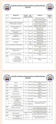 ويشمل المنهاج عدداً من المواد التخصصية في مجالات الكيمياء الدوائية، وعلم الأدوية، والعلاجيات، والصيدلانيات، وعلم السموم، والكيمياء الحياتية، مع اعتماد مصادر علمية عالمية معتمدة، بما يضمن شمولية التقييم ودقته.