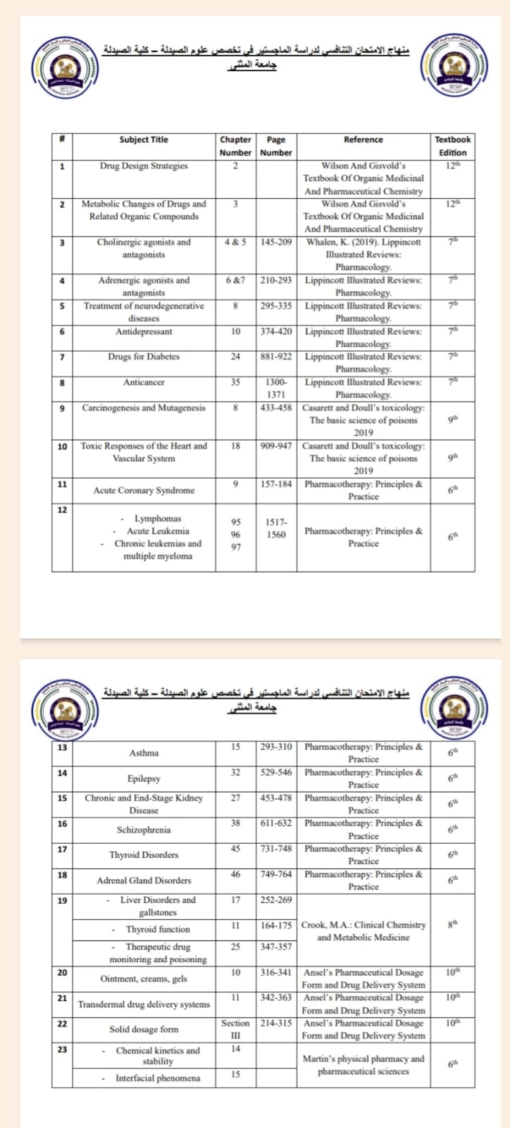 كلية الصيدلة في جامعة المثنى تعلن منهاج الامتحان التنافسي للدراسات العليا